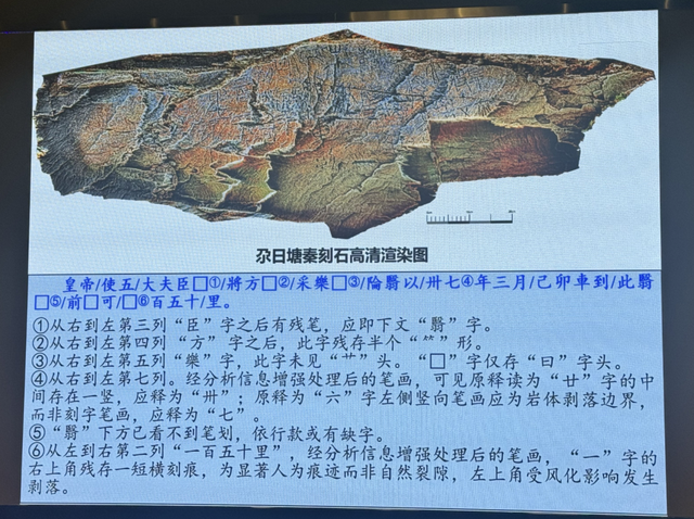 国家文物局发布了对石刻的释读结果。全文共12行36字,外加合文1字,共37字,文字风格属秦篆,保存较完整的文字信息为“皇帝/使五/大夫臣□/將方□/采樂□/陯翳以/卅七年三月/己卯車到/此翳□/前□可/□百五十/里”。