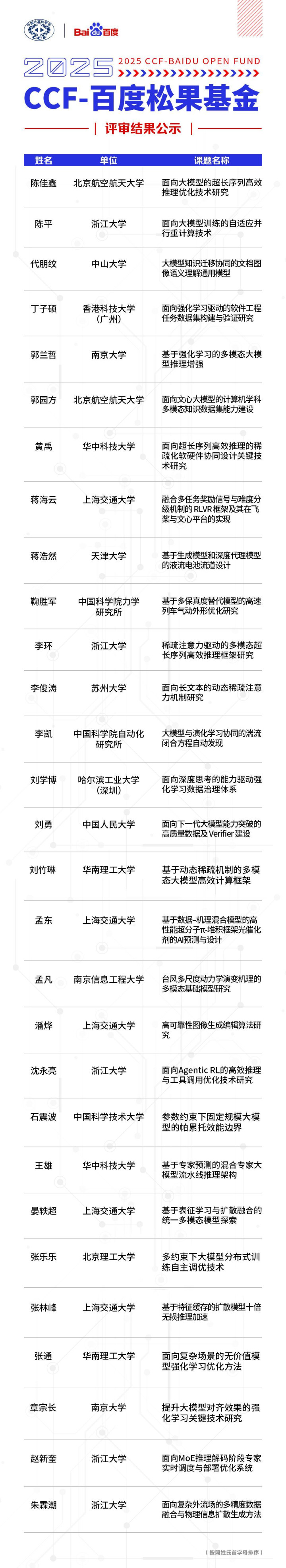 2025年CCF-百度松果基金入选课题结果如下: