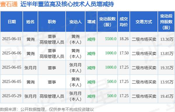 壹石通近半年内的董监高及核心技术人员增减持详情如下: